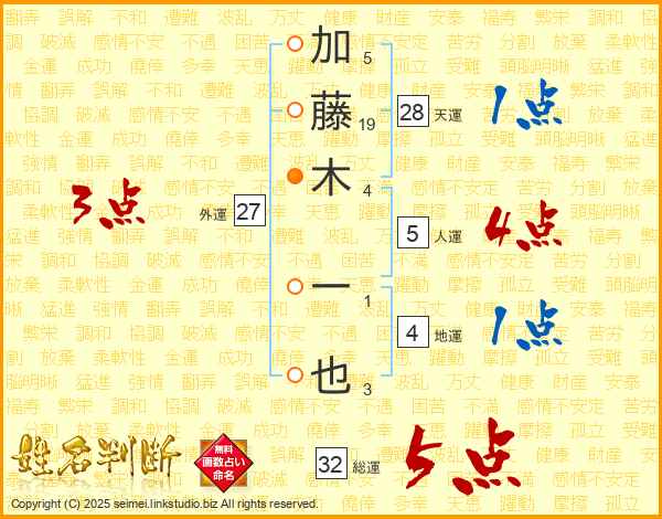 加(5画)藤(19画)木(4画) 一(1画)也(3画)