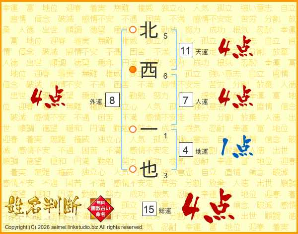 生活面を象徴する運勢です。外部から受ける影響力を表し、結婚運、家庭運や職場、環境への順応性を表します。総運から人運を引いた画数。姓や名が1文字の場合を除く。