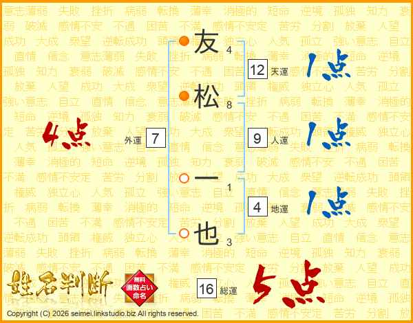 あなたの人生を表す1番重要な運勢です。生涯を通じて影響する総合運となり、主に50歳以降の晩年期に影響を及ぼします。苗字と名前の合計画数。