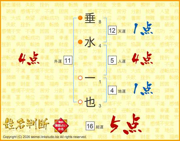 生活面を象徴する運勢です。外部から受ける影響力を表し、結婚運、家庭運や職場、環境への順応性を表します。総運から人運を引いた画数。姓や名が1文字の場合を除く。