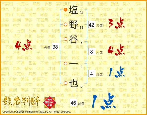 塩(24画)野(11画)谷(7画) 一(1画)也(3画)