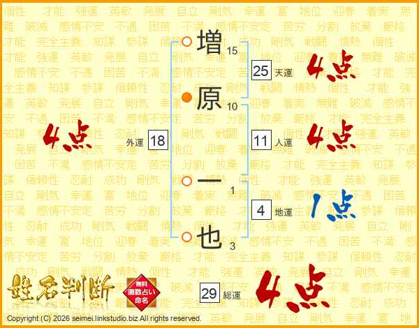 家系が持つ宿命的な運勢を表します。祖先から受け継いだ苗字ですので自分の力が及びません。家柄を象徴します。苗字の合計画数。