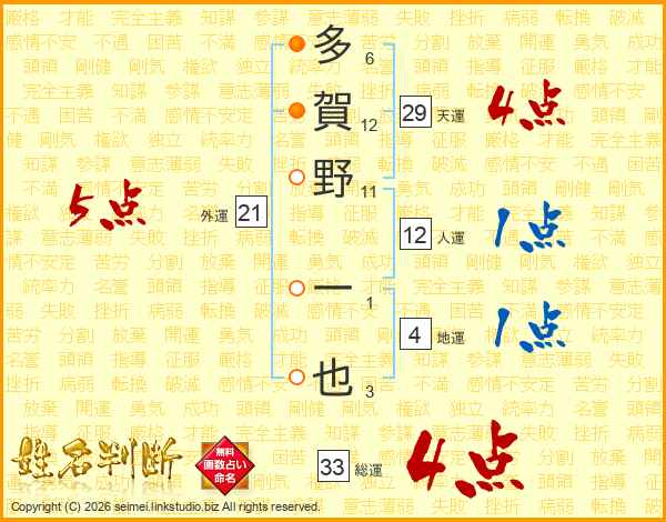 多(6画)賀(12画)野(11画) 一(1画)也(3画)