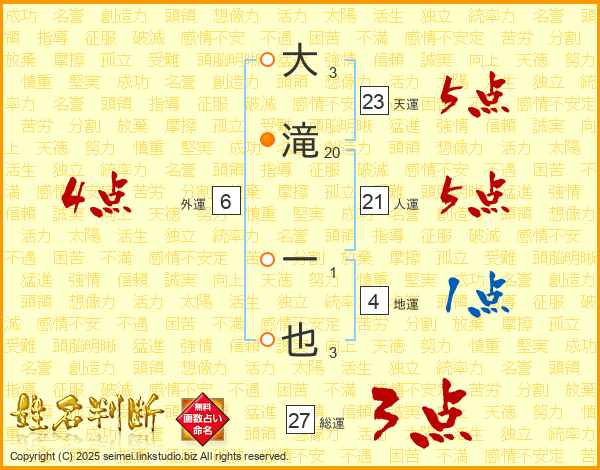 あなたの人生を表す1番重要な運勢です。生涯を通じて影響する総合運となり、主に50歳以降の晩年期に影響を及ぼします。苗字と名前の合計画数。