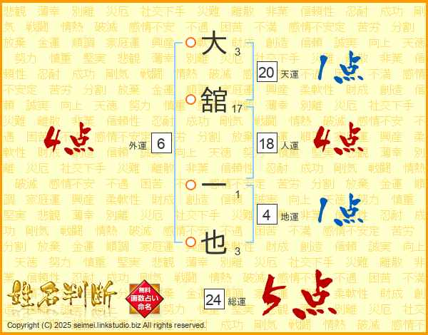 生活面を象徴する運勢です。外部から受ける影響力を表し、結婚運、家庭運や職場、環境への順応性を表します。総運から人運を引いた画数。姓や名が1文字の場合を除く。