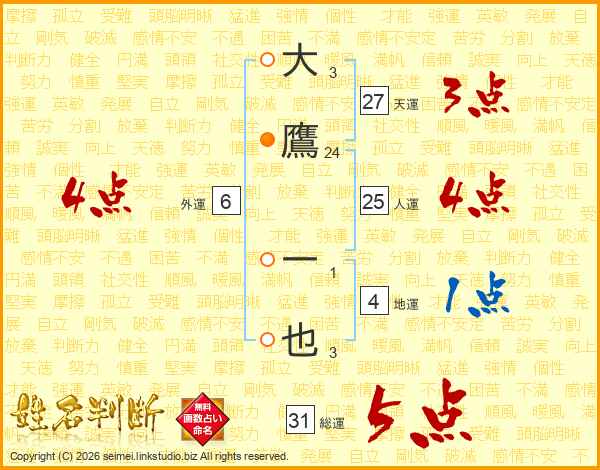 あなたの人生を表す1番重要な運勢です。生涯を通じて影響する総合運となり、主に50歳以降の晩年期に影響を及ぼします。苗字と名前の合計画数。