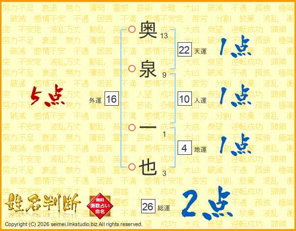 奥泉一也さんの総運は26画の2点!