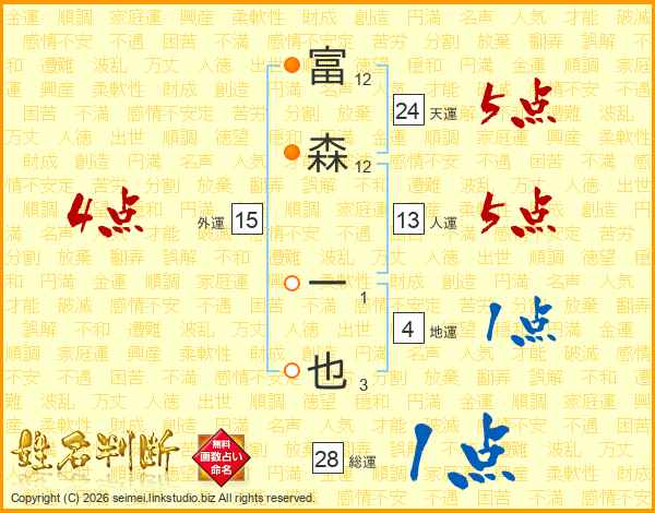生活面を象徴する運勢です。外部から受ける影響力を表し、結婚運、家庭運や職場、環境への順応性を表します。総運から人運を引いた画数。姓や名が1文字の場合を除く。