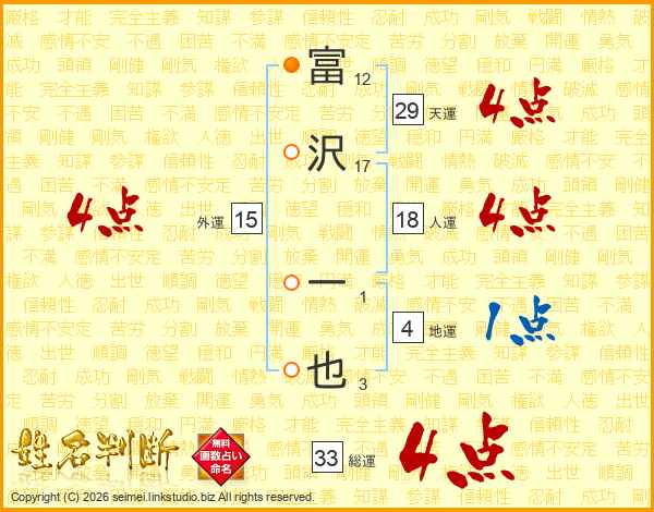 生活面を象徴する運勢です。外部から受ける影響力を表し、結婚運、家庭運や職場、環境への順応性を表します。総運から人運を引いた画数。姓や名が1文字の場合を除く。