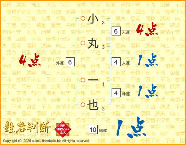生活面を象徴する運勢です。外部から受ける影響力を表し、結婚運、家庭運や職場、環境への順応性を表します。総運から人運を引いた画数。姓や名が1文字の場合を除く。
