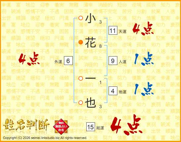 生活面を象徴する運勢です。外部から受ける影響力を表し、結婚運、家庭運や職場、環境への順応性を表します。総運から人運を引いた画数。姓や名が1文字の場合を除く。