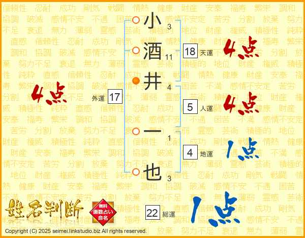 生活面を象徴する運勢です。外部から受ける影響力を表し、結婚運、家庭運や職場、環境への順応性を表します。総運から人運を引いた画数。姓や名が1文字の場合を除く。