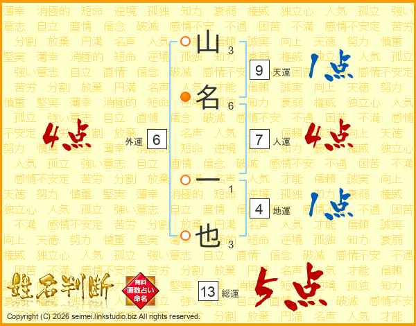 生活面を象徴する運勢です。外部から受ける影響力を表し、結婚運、家庭運や職場、環境への順応性を表します。総運から人運を引いた画数。姓や名が1文字の場合を除く。