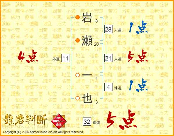 岩(8画)瀬(20画) 一(1画)也(3画)