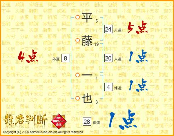 生活面を象徴する運勢です。外部から受ける影響力を表し、結婚運、家庭運や職場、環境への順応性を表します。総運から人運を引いた画数。姓や名が1文字の場合を除く。