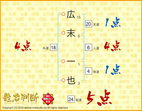 生活面を象徴する運勢です。外部から受ける影響力を表し、結婚運、家庭運や職場、環境への順応性を表します。総運から人運を引いた画数。姓や名が1文字の場合を除く。