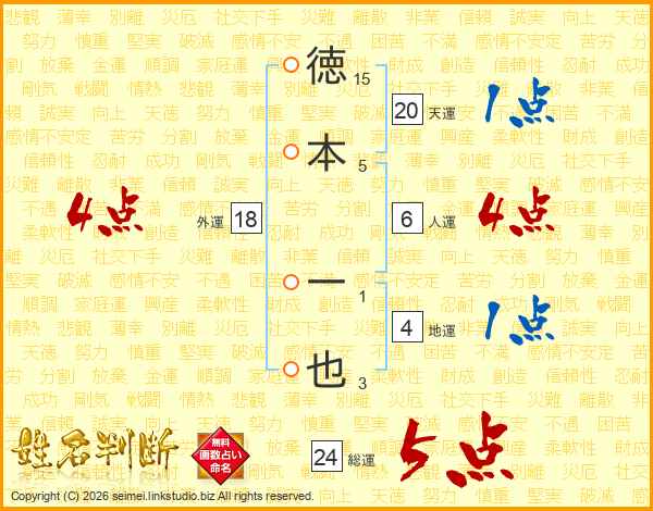 徳(15画)本(5画) 一(1画)也(3画)
