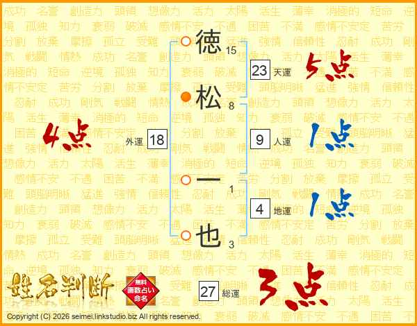 徳(15画)松(8画) 一(1画)也(3画)
