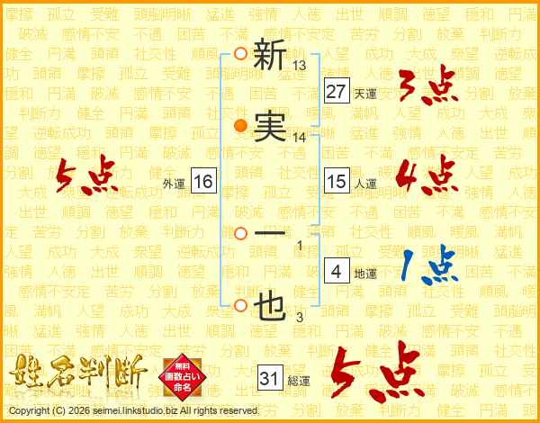 新(13画)実(14画) 一(1画)也(3画)