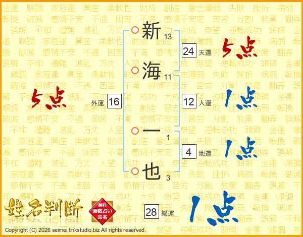 生活面を象徴する運勢です。外部から受ける影響力を表し、結婚運、家庭運や職場、環境への順応性を表します。総運から人運を引いた画数。姓や名が1文字の場合を除く。