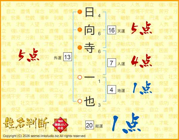 日(4画)向(6画)寺(6画) 一(1画)也(3画)