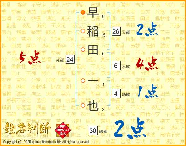 早(6画)稲(15画)田(5画) 一(1画)也(3画)