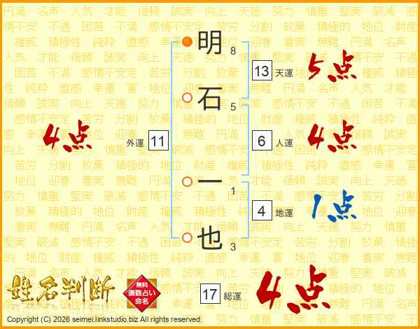 あなたの人生を表す1番重要な運勢です。生涯を通じて影響する総合運となり、主に50歳以降の晩年期に影響を及ぼします。苗字と名前の合計画数。