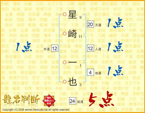 生活面を象徴する運勢です。外部から受ける影響力を表し、結婚運、家庭運や職場、環境への順応性を表します。総運から人運を引いた画数。姓や名が1文字の場合を除く。