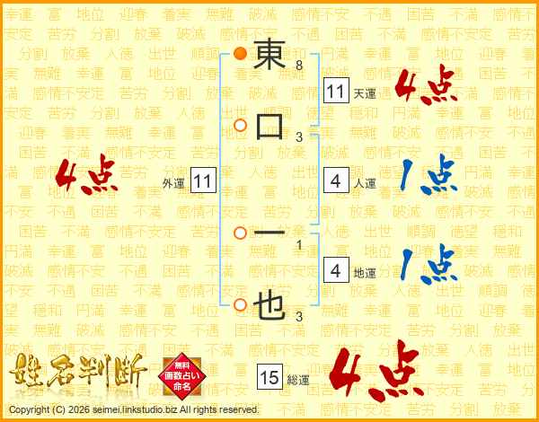 生活面を象徴する運勢です。外部から受ける影響力を表し、結婚運、家庭運や職場、環境への順応性を表します。総運から人運を引いた画数。姓や名が1文字の場合を除く。