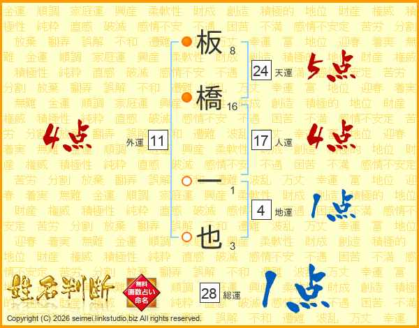 板橋一也さんの人運は17画の4点!