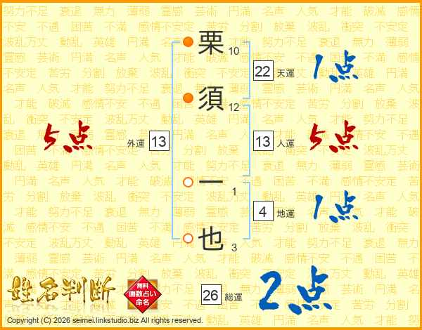 生活面を象徴する運勢です。外部から受ける影響力を表し、結婚運、家庭運や職場、環境への順応性を表します。総運から人運を引いた画数。姓や名が1文字の場合を除く。
