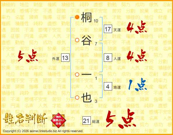 桐谷一也さんの総運は21画の5点!