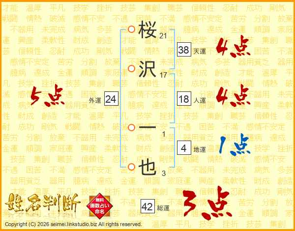 桜沢一也さんの天運は38画の4点!