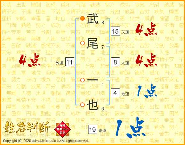 生活面を象徴する運勢です。外部から受ける影響力を表し、結婚運、家庭運や職場、環境への順応性を表します。総運から人運を引いた画数。姓や名が1文字の場合を除く。