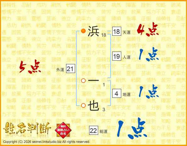 あなたの人生を表す1番重要な運勢です。生涯を通じて影響する総合運となり、主に50歳以降の晩年期に影響を及ぼします。苗字と名前の合計画数。