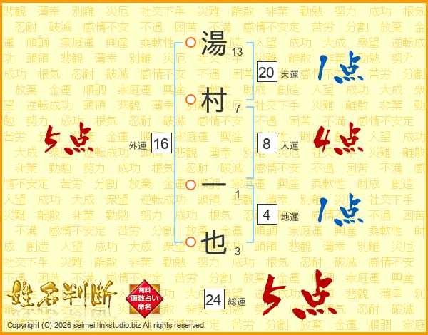 生活面を象徴する運勢です。外部から受ける影響力を表し、結婚運、家庭運や職場、環境への順応性を表します。総運から人運を引いた画数。姓や名が1文字の場合を除く。