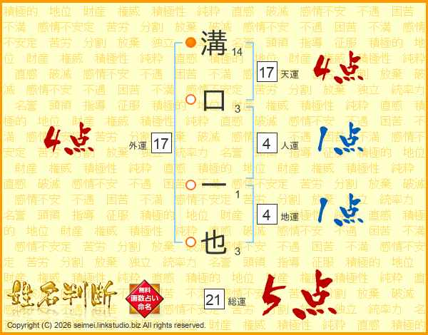 生活面を象徴する運勢です。外部から受ける影響力を表し、結婚運、家庭運や職場、環境への順応性を表します。総運から人運を引いた画数。姓や名が1文字の場合を除く。