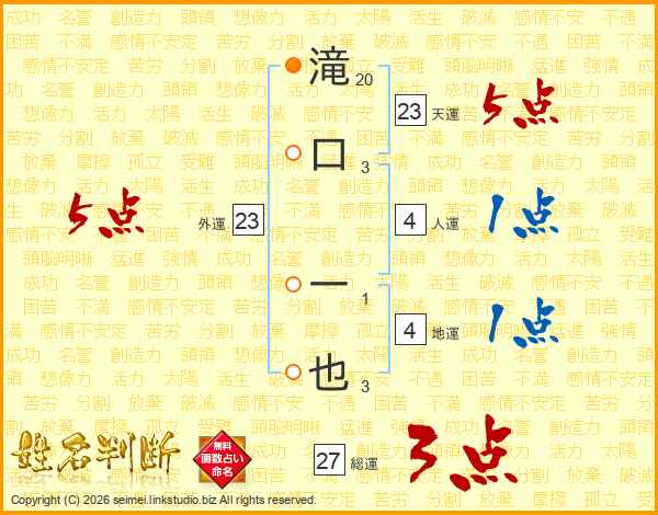 滝(20画)口(3画) 一(1画)也(3画)