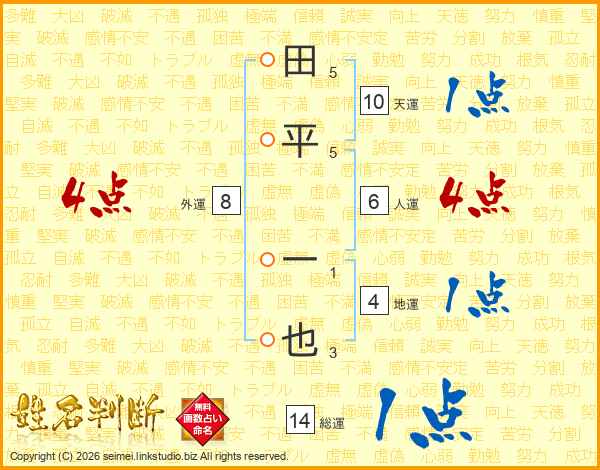 生活面を象徴する運勢です。外部から受ける影響力を表し、結婚運、家庭運や職場、環境への順応性を表します。総運から人運を引いた画数。姓や名が1文字の場合を除く。