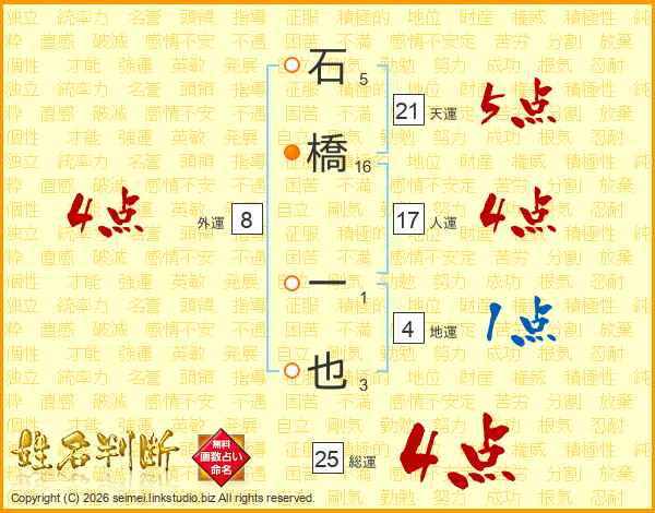 生活面を象徴する運勢です。外部から受ける影響力を表し、結婚運、家庭運や職場、環境への順応性を表します。総運から人運を引いた画数。姓や名が1文字の場合を除く。