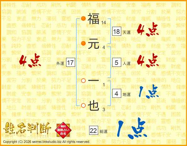 生活面を象徴する運勢です。外部から受ける影響力を表し、結婚運、家庭運や職場、環境への順応性を表します。総運から人運を引いた画数。姓や名が1文字の場合を除く。