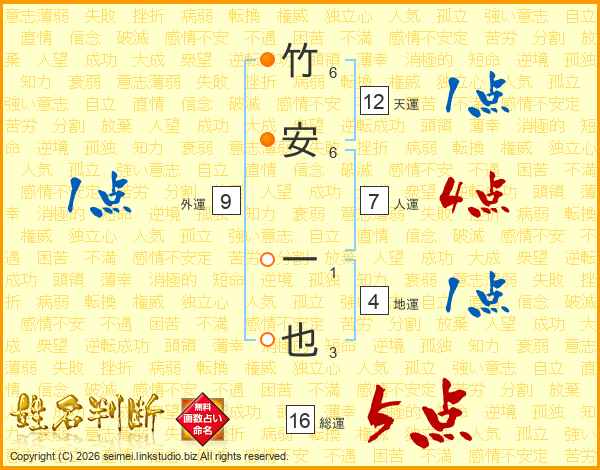 竹安一也さんの総運は16画の5点!