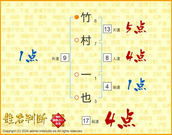 生活面を象徴する運勢です。外部から受ける影響力を表し、結婚運、家庭運や職場、環境への順応性を表します。総運から人運を引いた画数。姓や名が1文字の場合を除く。