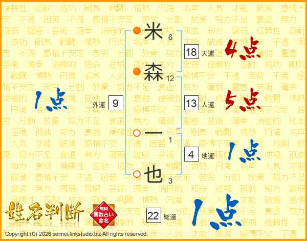 あなたの人生を表す1番重要な運勢です。生涯を通じて影響する総合運となり、主に50歳以降の晩年期に影響を及ぼします。苗字と名前の合計画数。