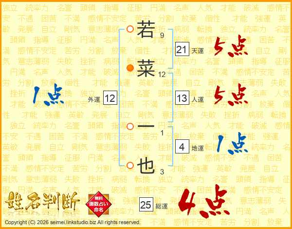 生活面を象徴する運勢です。外部から受ける影響力を表し、結婚運、家庭運や職場、環境への順応性を表します。総運から人運を引いた画数。姓や名が1文字の場合を除く。