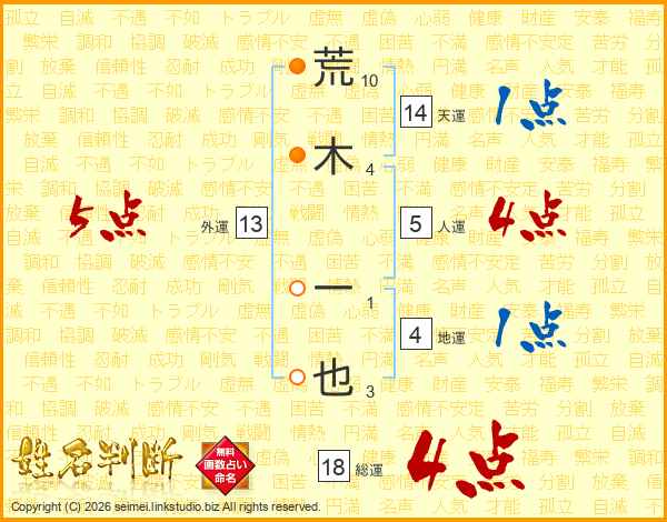 荒(10画)木(4画) 一(1画)也(3画)