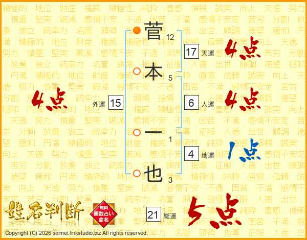 あなたの人生を表す1番重要な運勢です。生涯を通じて影響する総合運となり、主に50歳以降の晩年期に影響を及ぼします。苗字と名前の合計画数。