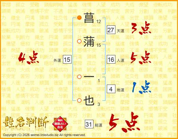 菖(12画)蒲(15画) 一(1画)也(3画)