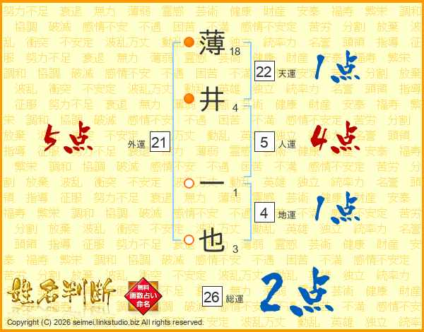 薄(18画)井(4画) 一(1画)也(3画)