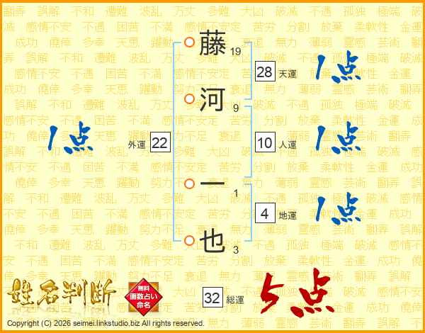 生活面を象徴する運勢です。外部から受ける影響力を表し、結婚運、家庭運や職場、環境への順応性を表します。総運から人運を引いた画数。姓や名が1文字の場合を除く。